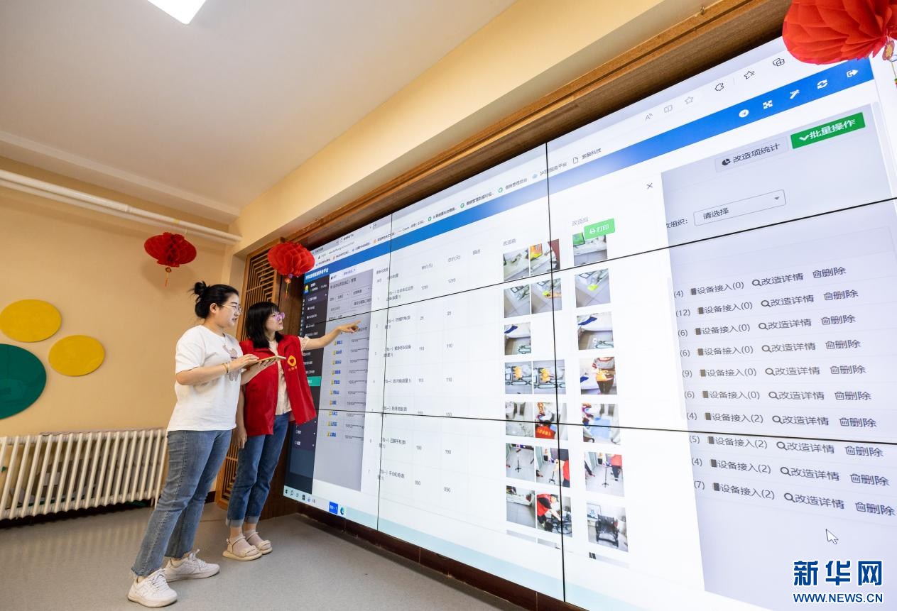 6月25日,工作人员在呼和浩特市玉泉区康乐社区养老服务综合体通过智慧养老平台查看适老化改造工单进度。新华网发(丁根厚 摄)