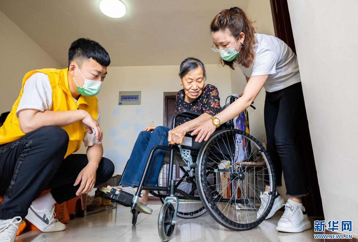 6月25日,工作人员在呼和浩特市玉泉区康居家园小区为老人演示轮椅的使用方法。新华网发(丁根厚 摄)
