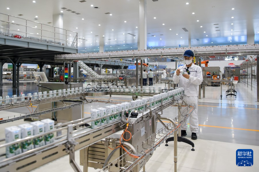 图为在位于呼和浩特市的伊利现代智慧健康谷液态奶全球智造标杆基地,工人在生产线上作业。新华社记者 李志鹏 摄