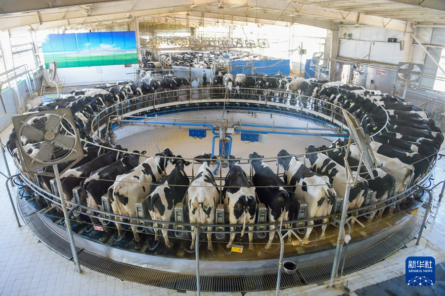 在牧场,80头牛站在一个缓缓旋转的转盘上挤奶,只需十几分钟就可由机器自动化完成。敕勒川生态智慧牧场场长甘洪伟说,缓慢旋转是为了让牛感到安全舒适。“牧场注重牛的生活生产体验,我们采用无人挤奶设施和自动饲喂系统,全程无人工干预,牧场还可自动将牛舍环境调整到适宜状态。”