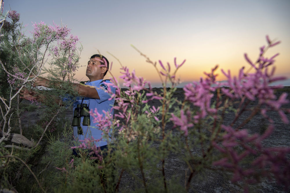 ↑2020年7月13日,新疆艾比湖湿地国家级自然保护区的生态管护员帕勒哈提在检查保护区内一处红柳的生长情况。
