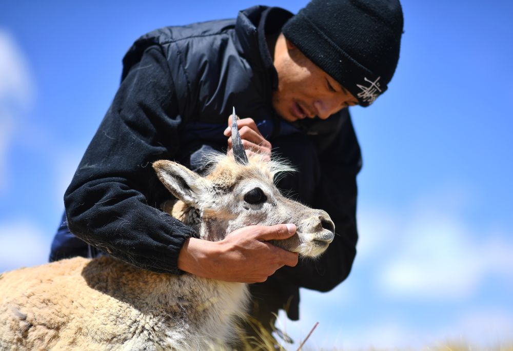↑2023年5月30日,在可可西里国家级自然保护区索南达杰保护站,巡山队员才文多杰和藏羚羊在一起。