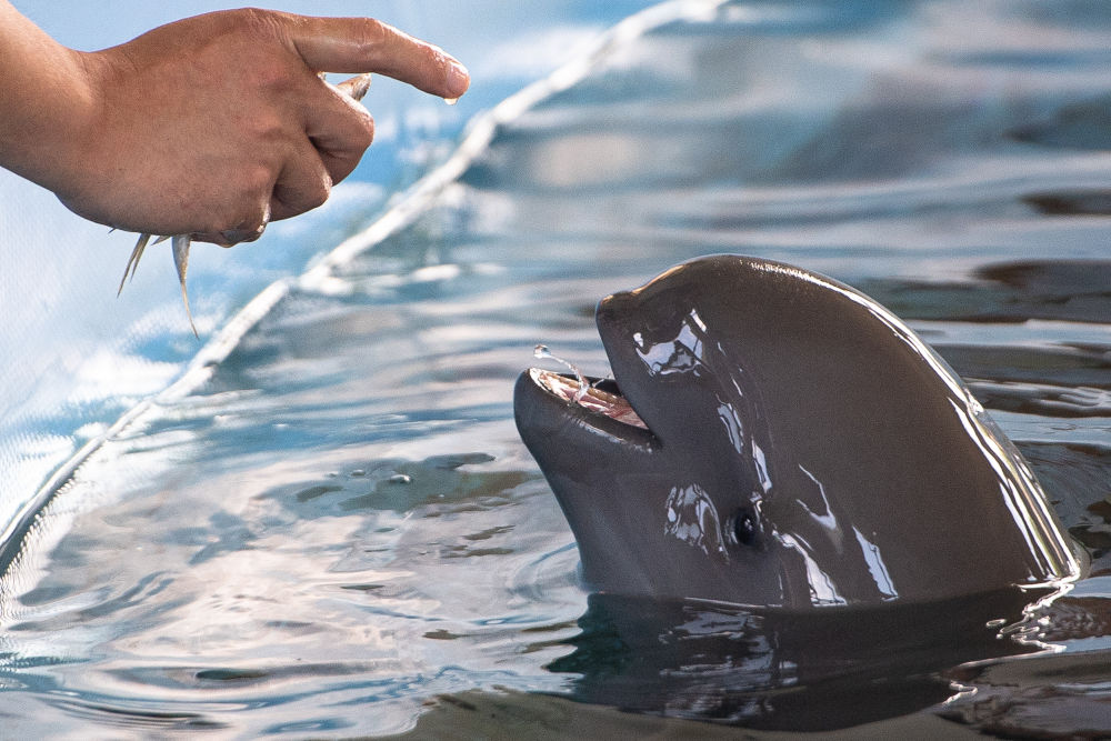 ↑2023年7月5日,中国科学院水生生物研究所白鱀豚馆训练员给小江豚“F9C22”喂食。多年以来,中国科学院水生生物研究所三代科研人员接力救护白鱀豚、江豚,努力保护长江濒危物种,共同守护“长江的微笑”。
