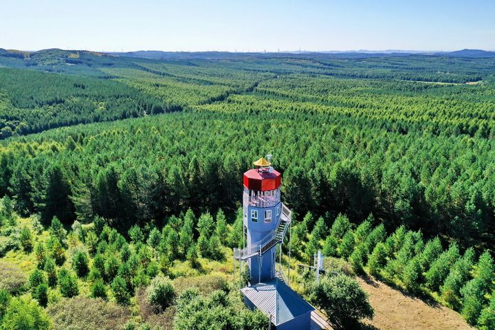 ↑这是在河北塞罕坝机械林场拍摄的望海楼(2021年8月23日摄,无人机照片)。