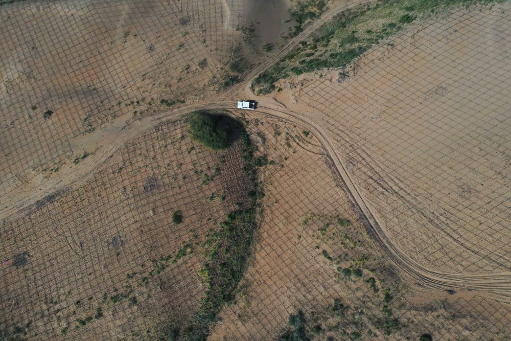 ↑2023年8月11日,运载沙障原材料——沙柳条的车辆在达拉特旗境内的库布其沙漠中行驶(无人机照片)。为进一步加强荒漠化综合防治,内蒙古鄂尔多斯市达拉特旗组织干部群众、治沙工人深入库布其沙漠栽设沙障,防风固沙。