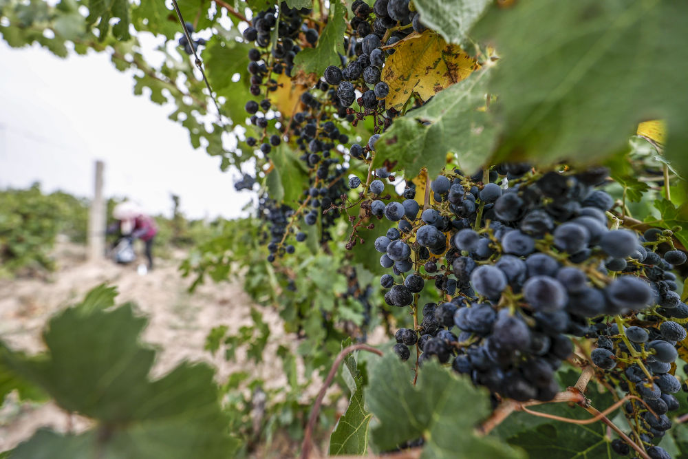↑2021年10月14日,工人在宁夏西鸽酒庄葡萄园采摘酿酒葡萄。宁夏贺兰山东麓位于北纬37度至39度,是世界公认的酿酒葡萄种植的“黄金地带”。