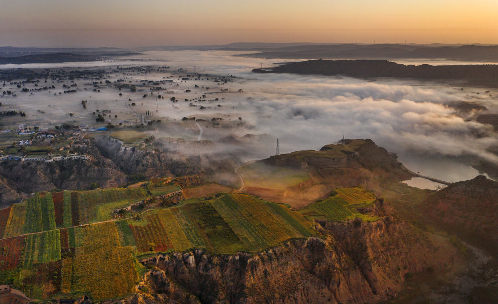 ↑2020年9月24日清晨,靖边县龙洲镇云雾缭绕(无人机照片)。北接毛乌素沙地的匈奴故都统万城遗址位于陕西省靖边县,受恶劣生态环境影响,曾经的城池遗存一度埋于沙漠之下。近年来,靖边县实施了“三北”防护林、退耕还林、流域治理等生态建设工程,当地生态环境明显改善,统万城遗址已被一片绿荫环抱。