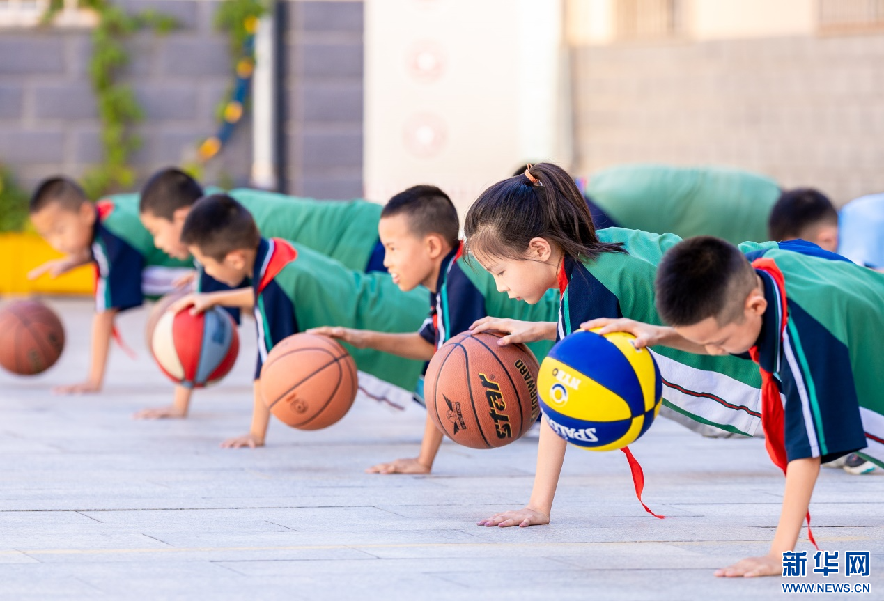 9月5日,呼和浩特市玉泉区恒昌店巷小学学生在练习篮球基本功。新华网发(丁根厚 摄)