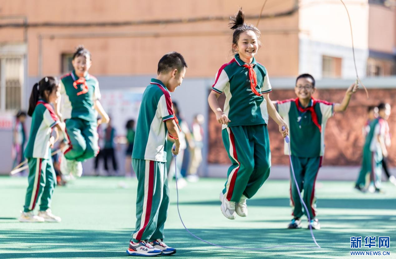9月5日,呼和浩特市玉泉区恒昌店巷小学学生在操场上练习花样跳绳。新华网发(丁根厚 摄)