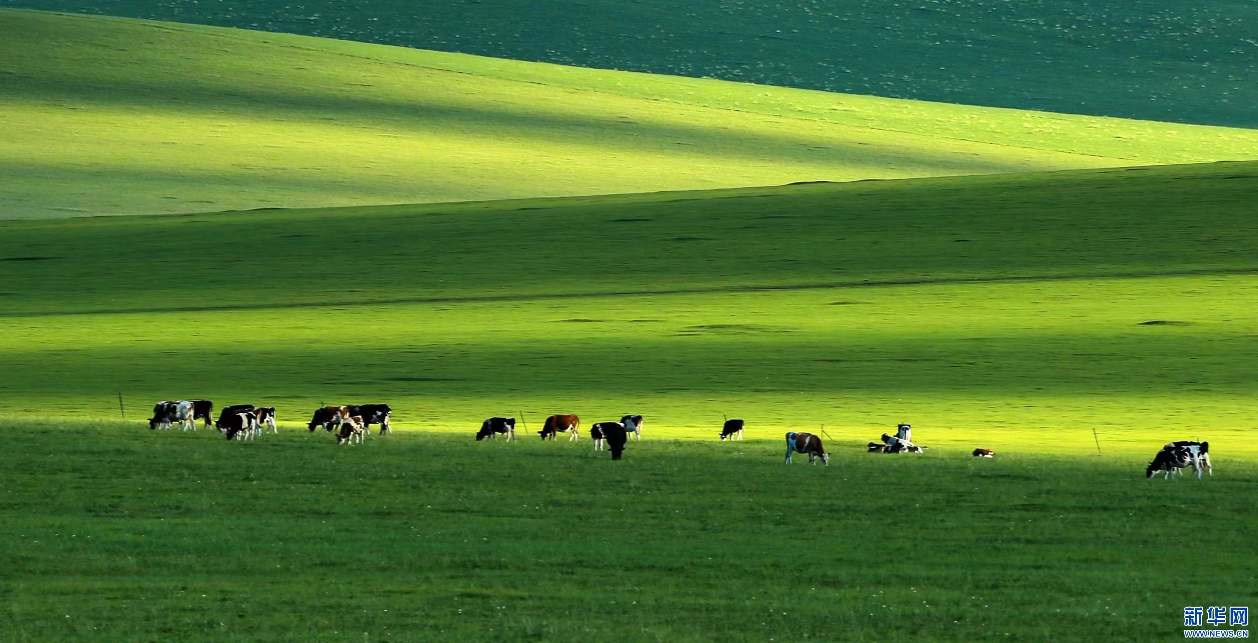 初秋,依旧翠绿的草原上,牛羊悠闲觅食。新华网发(耿金江摄)