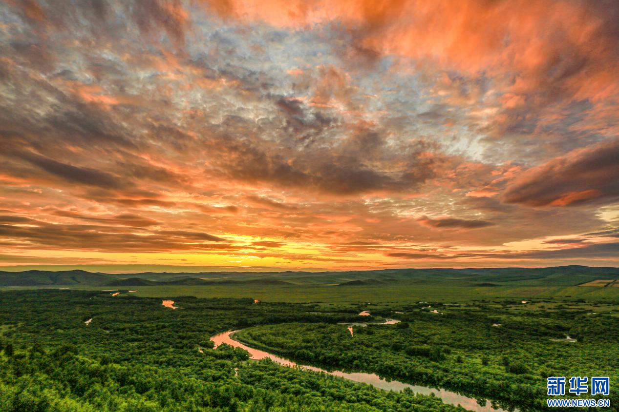 夕阳西下,额尔古纳湿地秋韵十足。新华网发(耿金江摄)