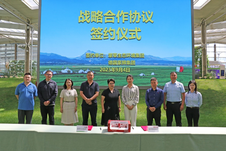 德国豪狮亚太区首席执行官吕晓晴(左6)与蒙草集团董事长兼总裁樊俊梅(左5)代表双方签约。