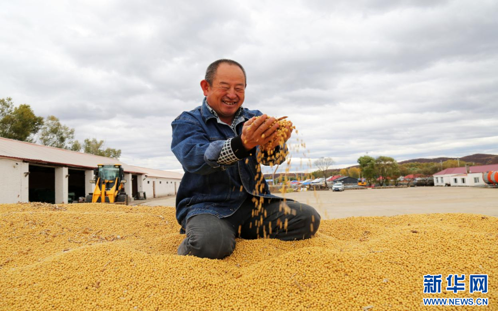 9月25日,诺敏河农牧场有限公司职工手捧大豆,享受丰收的喜悦。新华网发(宋丽丽 摄)
