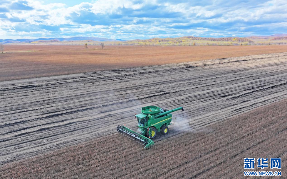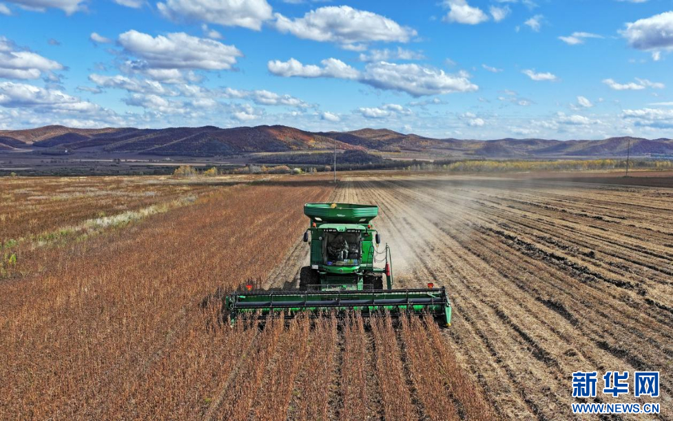 9月25日,联合收割机在诺敏河农牧场有限公司田间收割大豆。新华网发(韩冷 摄)