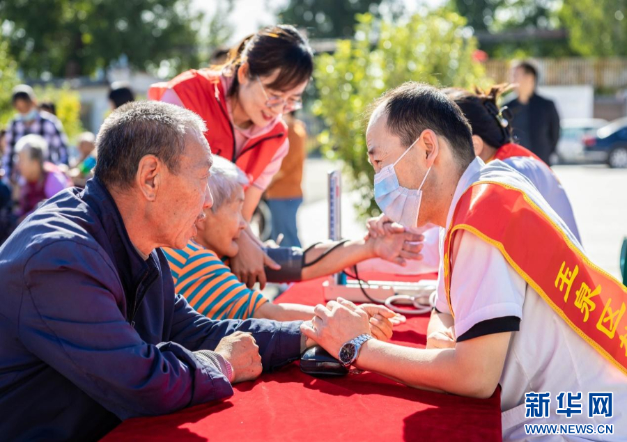 9月28日,呼和浩特市玉泉区新时代文明实践中心的志愿者在为老人们义诊。新华网发(丁根厚 摄)