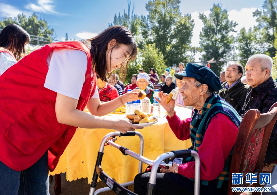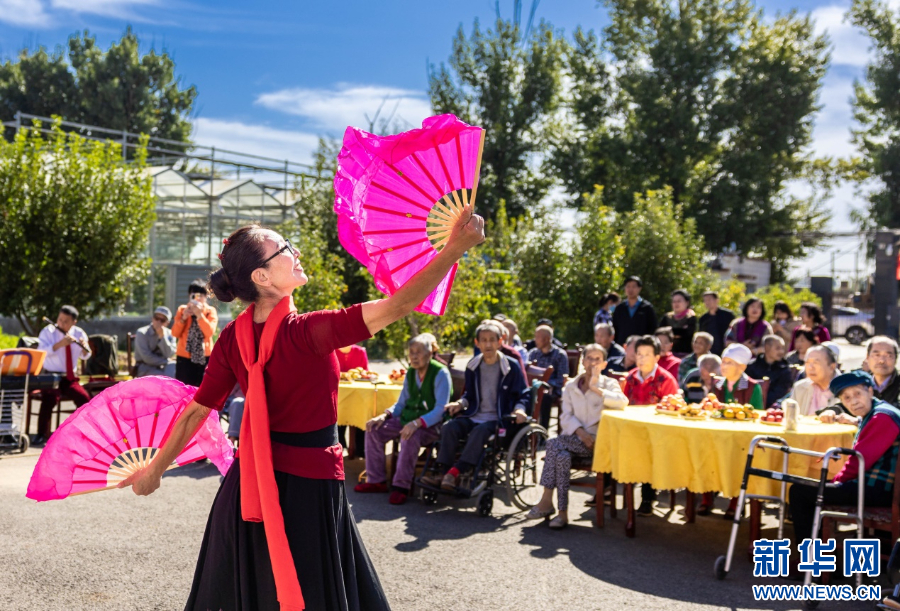 9月28日,呼和浩特市玉泉区新时代文明实践中心的志愿者为老人们表演文艺节目。新华网发(丁根厚 摄)