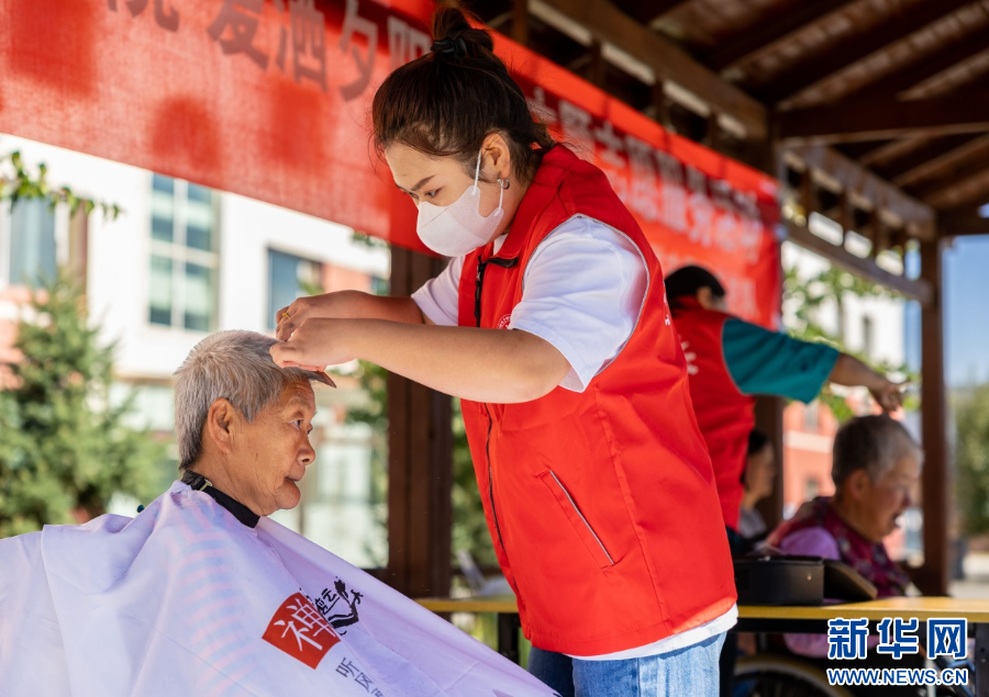 9月28日,呼和浩特市玉泉区新时代文明实践中心的志愿者在为老人们免费理发。新华网发(丁根厚 摄)