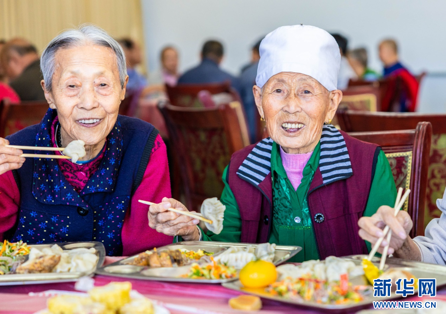 9月28日,呼和浩特市玉泉区敬松老年服务中心的老年人在开心地品尝爱心饺子。新华网发(丁根厚 摄)