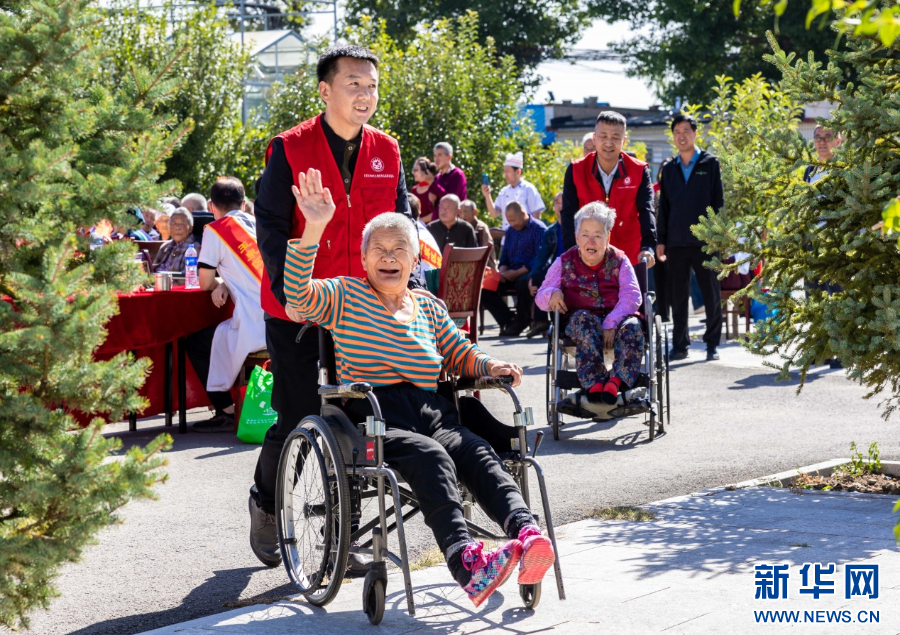 9月28日,呼和浩特市玉泉区民政局的党员志愿者陪老人前去免费理发。新华网发(丁根厚 摄)