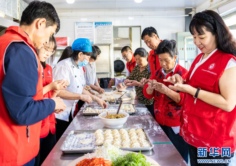 9月28日,呼和浩特市玉泉区民政局的党员志愿者在和老人们一起包饺子。新华网发(丁根厚 摄)