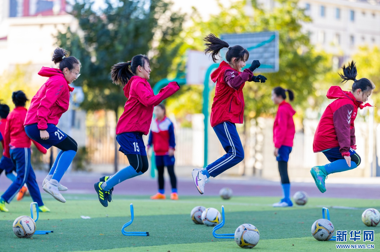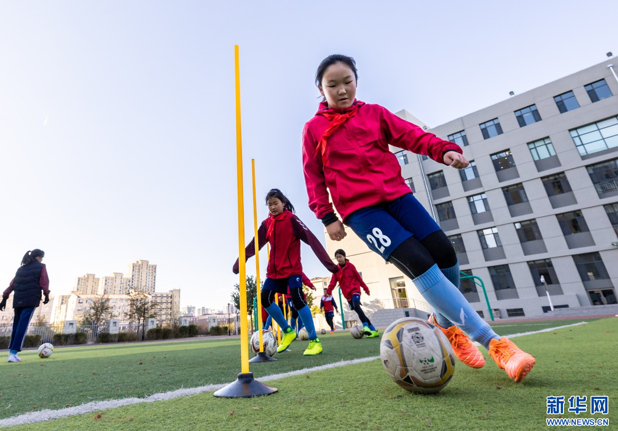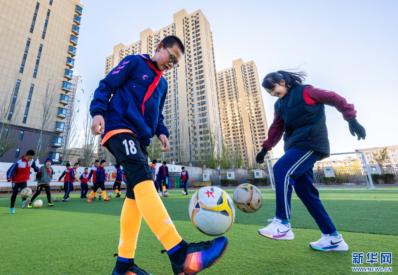 11月6日,呼和浩特市玉泉区石东路小学学生在练习颠球。新华网发(丁根厚 摄)