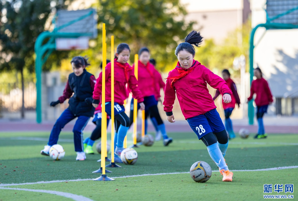 11月6日,呼和浩特市玉泉区石东路小学学生在进行带球训练。新华网发(丁根厚 摄)
