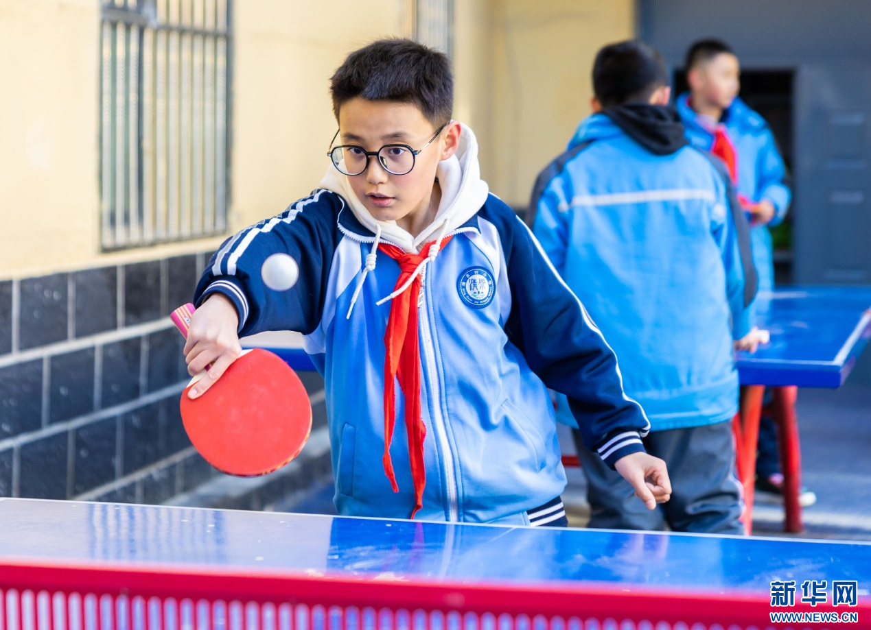 11月27日,呼和浩特市玉泉区清泉街小学学生利用课间时间打乒乓球。新华网发(丁根厚 摄)
