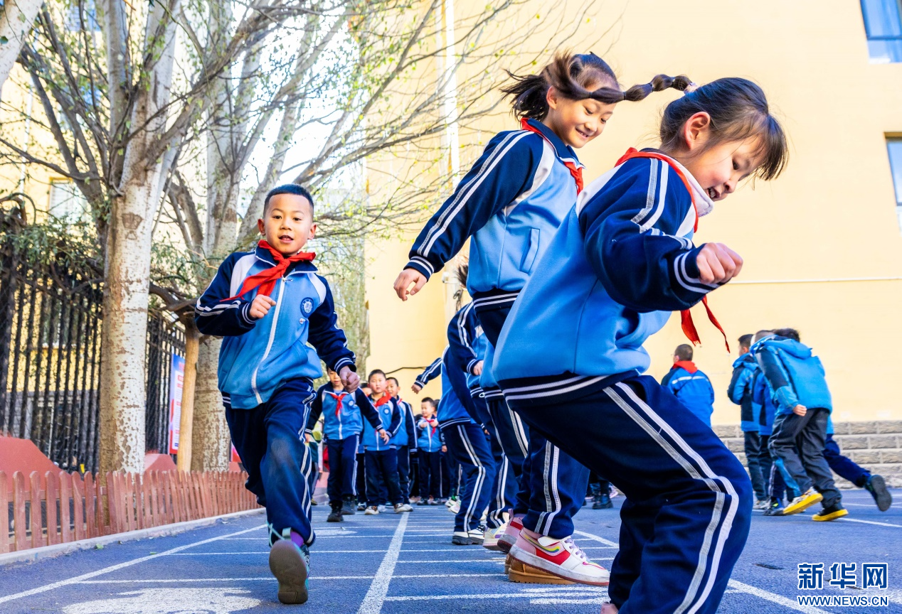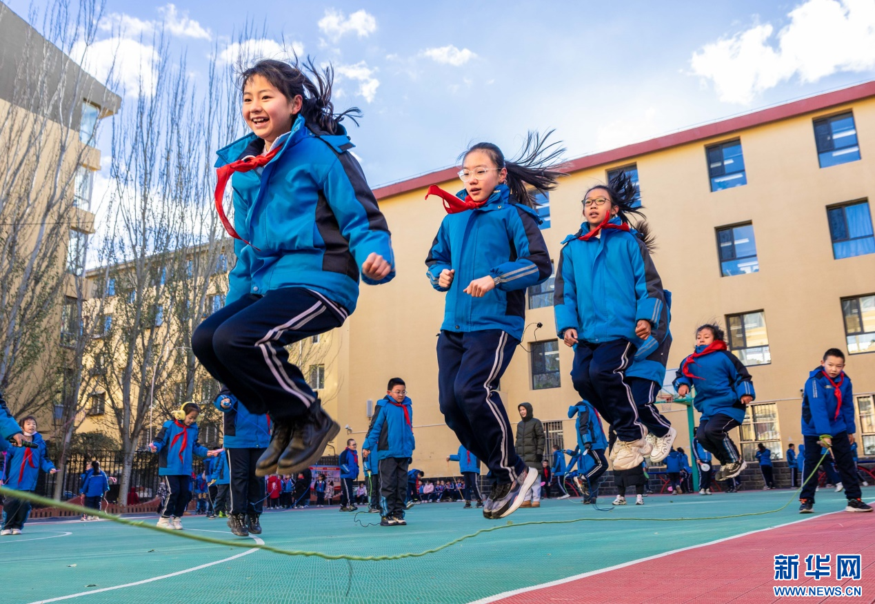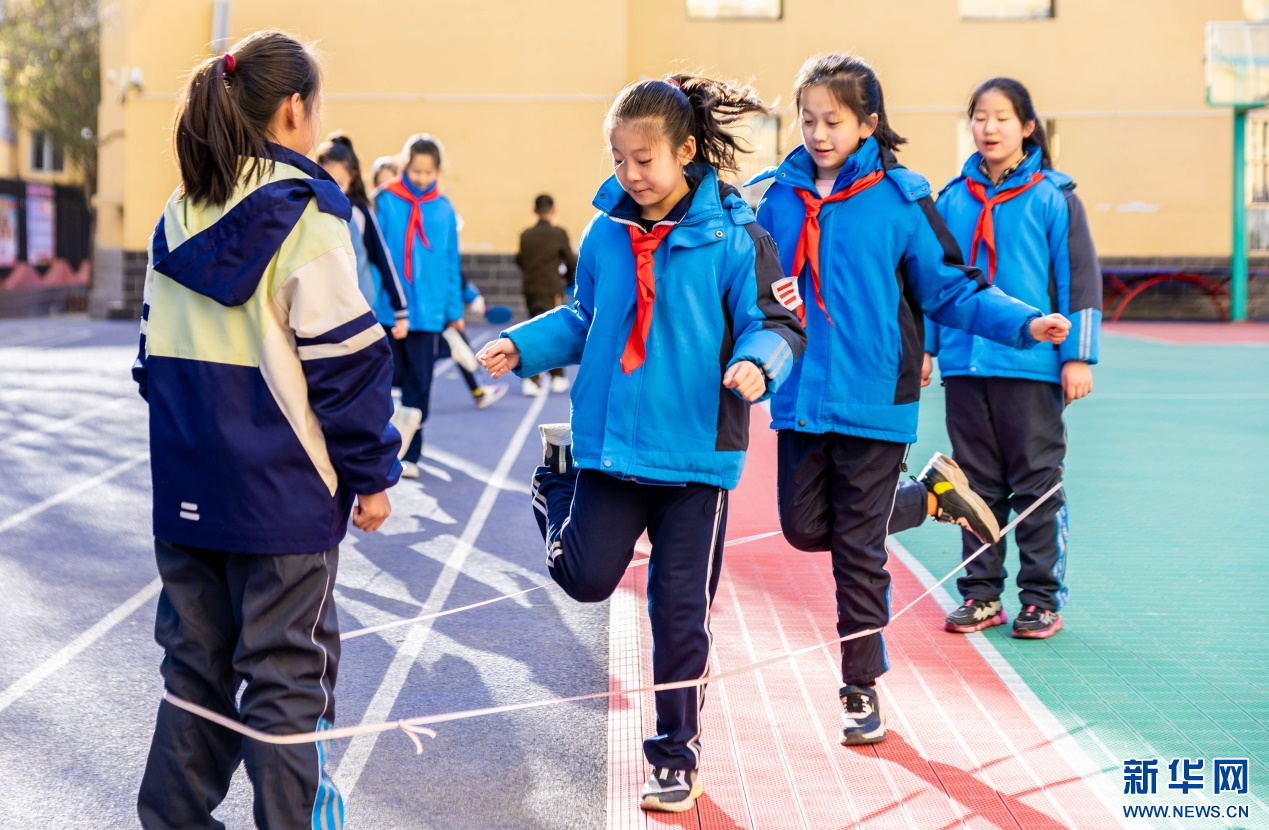 11月27日,呼和浩特市玉泉区清泉街小学学生利用课间时间玩跳绳。新华网发(丁根厚 摄)