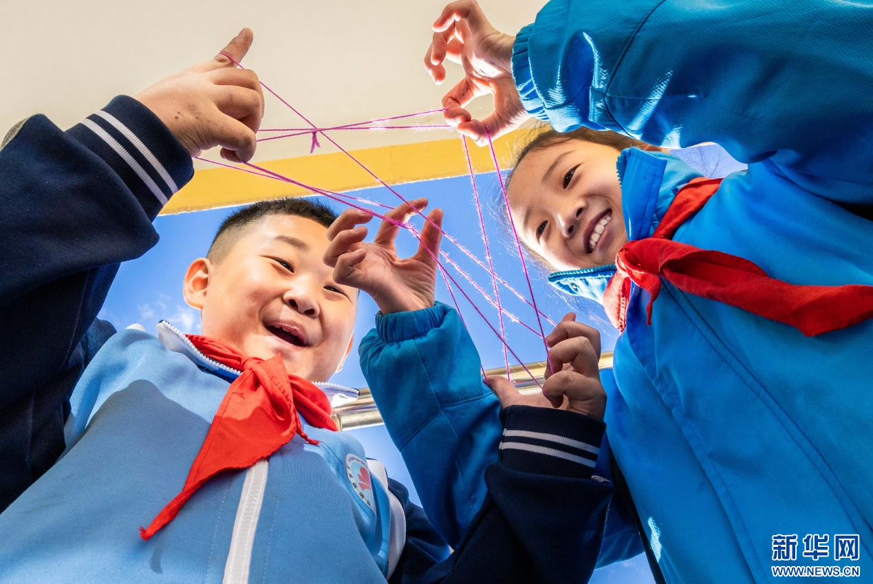 11月27日,呼和浩特市玉泉区清泉街小学学生利用课间时间玩翻花绳。新华网发(丁根厚 摄)
