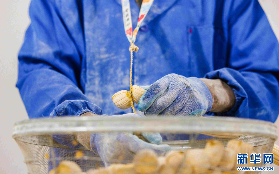 在工人手工拉伸中,麻糖产生小孔,形成酥脆的口感。新华网发(乌力更 摄)