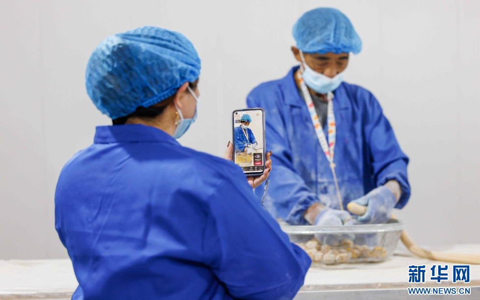 工人正在用手机直播传统麻糖的制作工艺。新华网发(乌力更 摄)