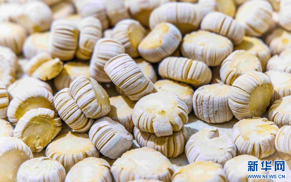 托克托县黑城村的麻糖呈现金黄色,在经过几十次反复拉伸后逐渐变白。新华网发(乌力更 摄)