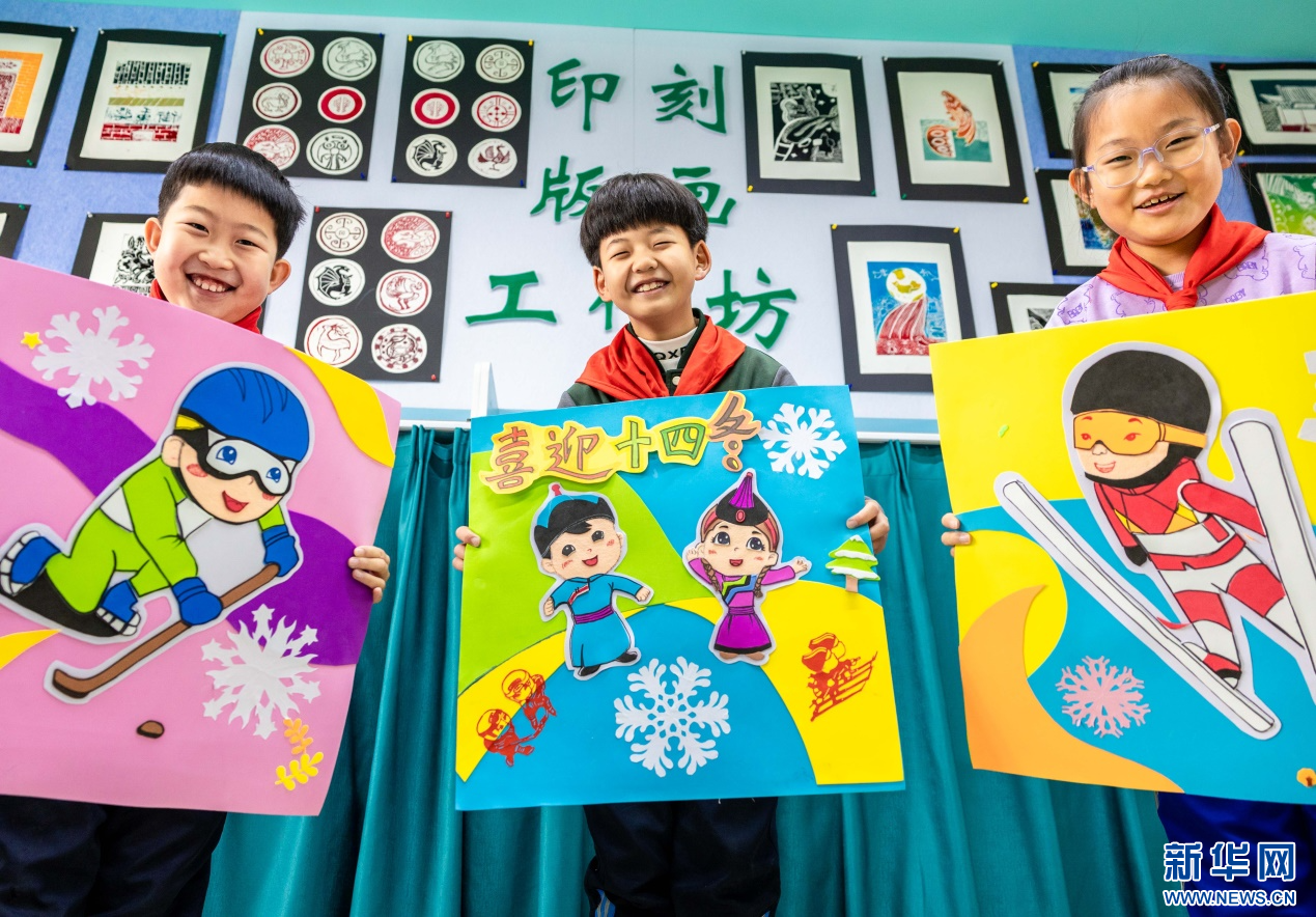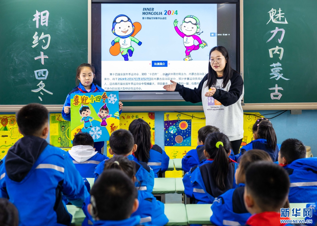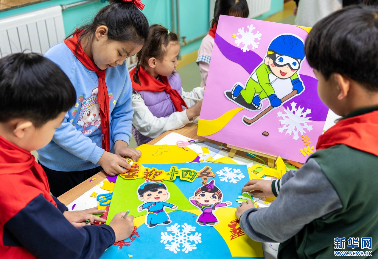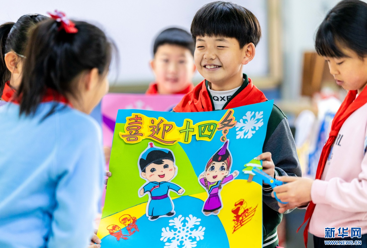 当日,内蒙古自治区呼和浩特市玉泉区小召小学开展“相约十四冬”系列活动。孩子们在老师带领下,共同绘制第十四届全国冬季运动会(简称“十四冬”)吉祥物——“安达”和“赛努”,并制作冰雪运动形象的手工创意作品,表达了全体师生对“十四冬”的期盼和祝福。