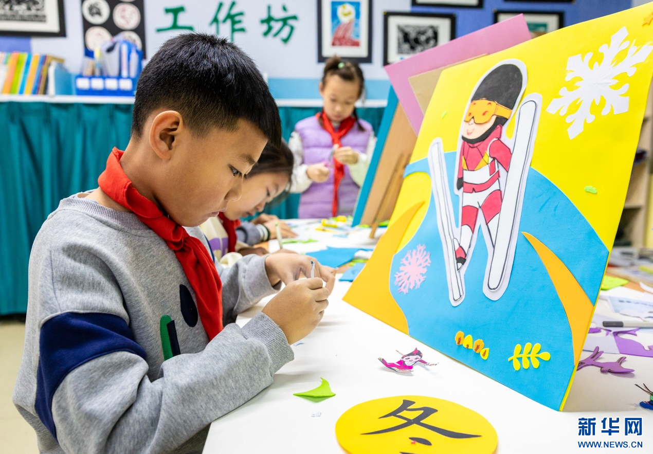 12月11日,呼和浩特市玉泉区小召小学学生在绘制“十四冬”运动形象手工作品。新华网发(丁根厚 摄)