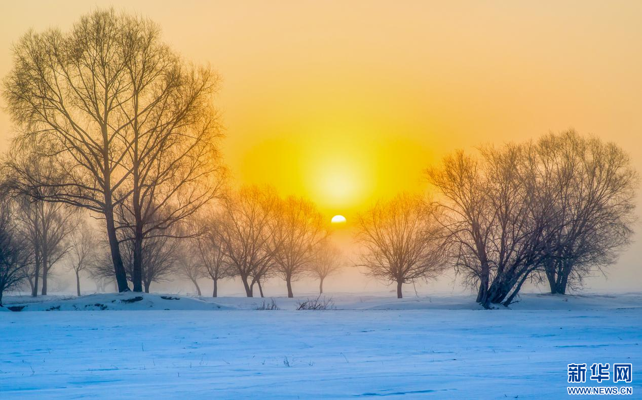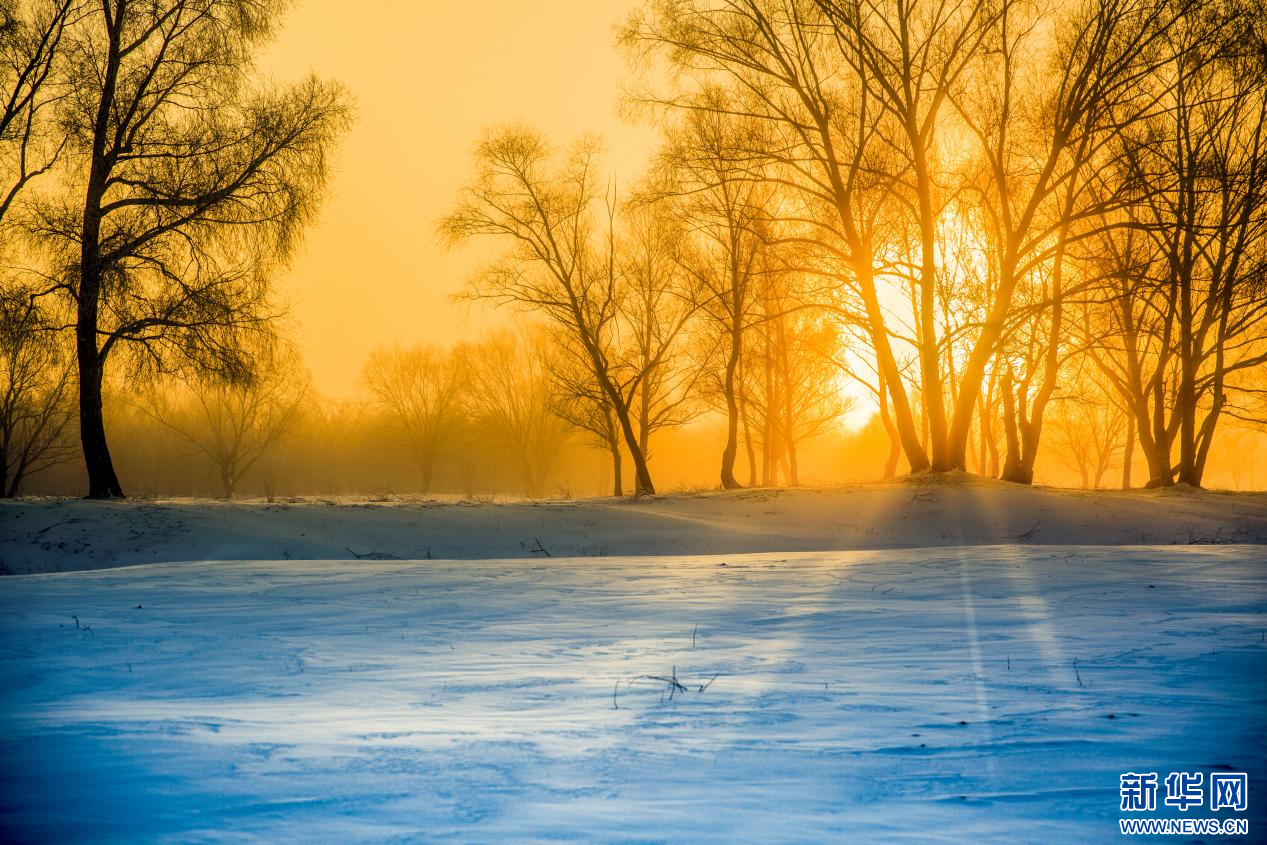 日出的光晕给银色的世界罩上了金色滤镜。新华网发(才广 摄)