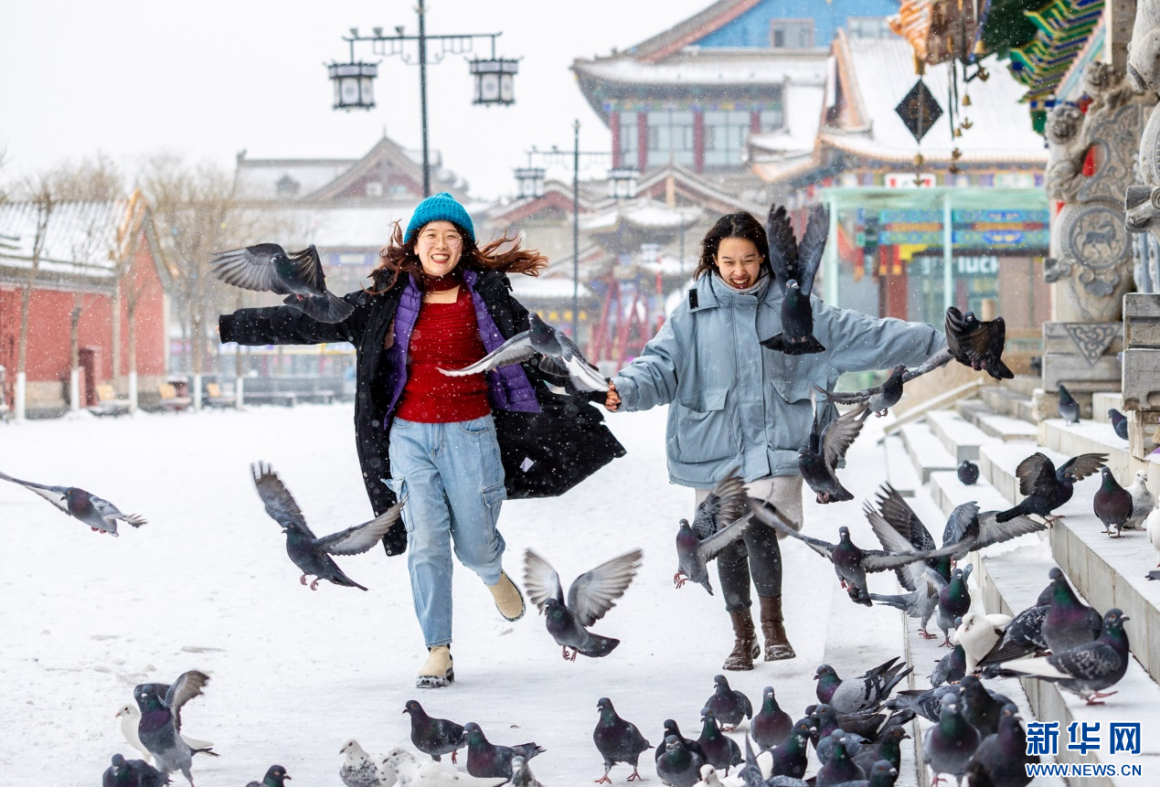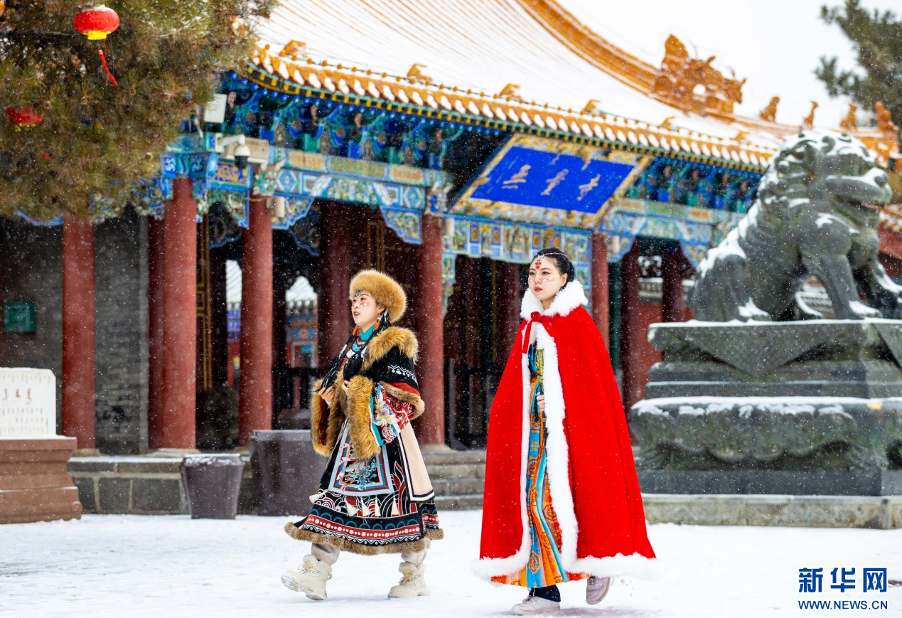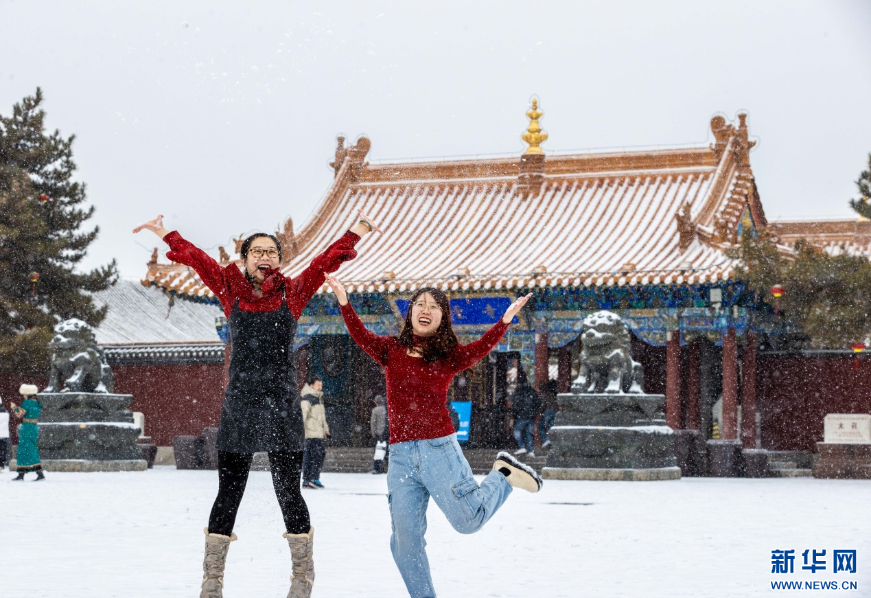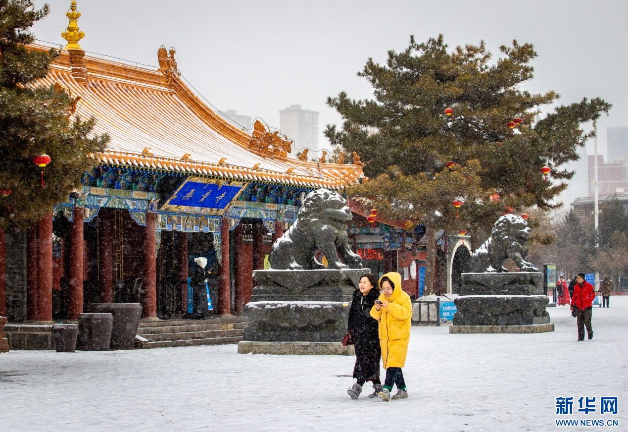 当日,内蒙古自治区呼和浩特市迎来降雪天气,当地的古建筑与冬雪相映成景,吸引众多游客前来玩雪赏景。