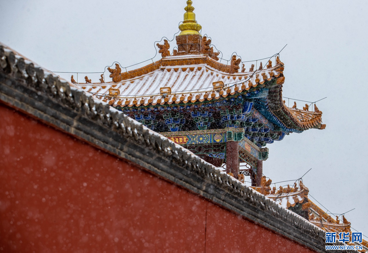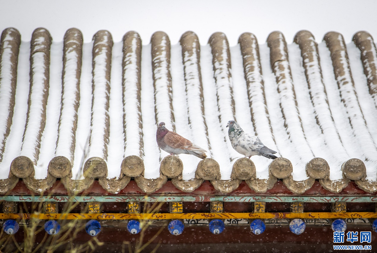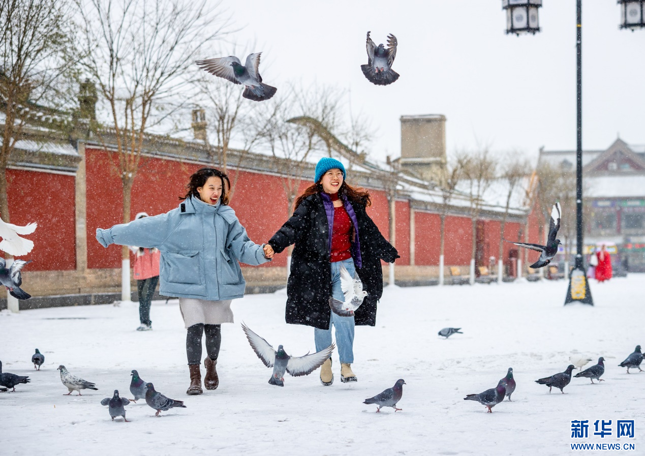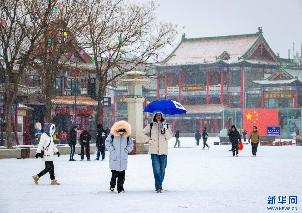 当日,内蒙古自治区呼和浩特市迎来降雪天气,当地的古建筑与冬雪相映成景,吸引众多游客前来玩雪赏景。