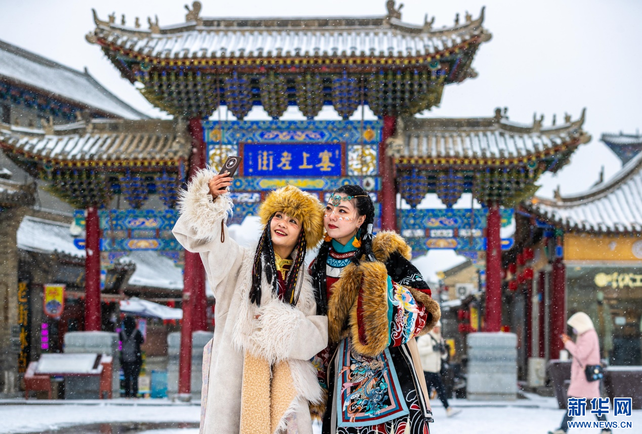 12月14日,游客在内蒙古自治区呼和浩特市玉泉区塞上老街文化旅游休闲街区游玩赏雪。新华网发(丁根厚 摄)