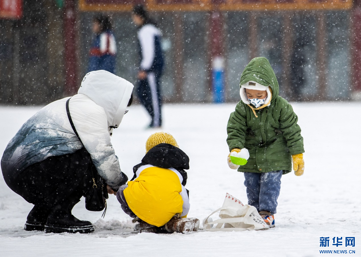 12月14日,家长陪伴小朋友在内蒙古自治区呼和浩特市玉泉区塞上老街文化旅游休闲街区玩雪。新华网发(丁根厚 摄)