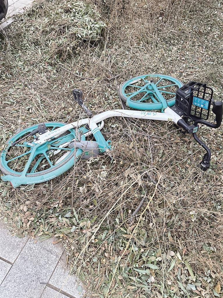 12月15日上午,在前进巷新希望家园东区西门附近,呼和浩特晚报记者看到路边的空地上躺着两辆共享单车,其中一辆车的车座不翼而飞,另外一辆共享单车的后车轱辘不见了。