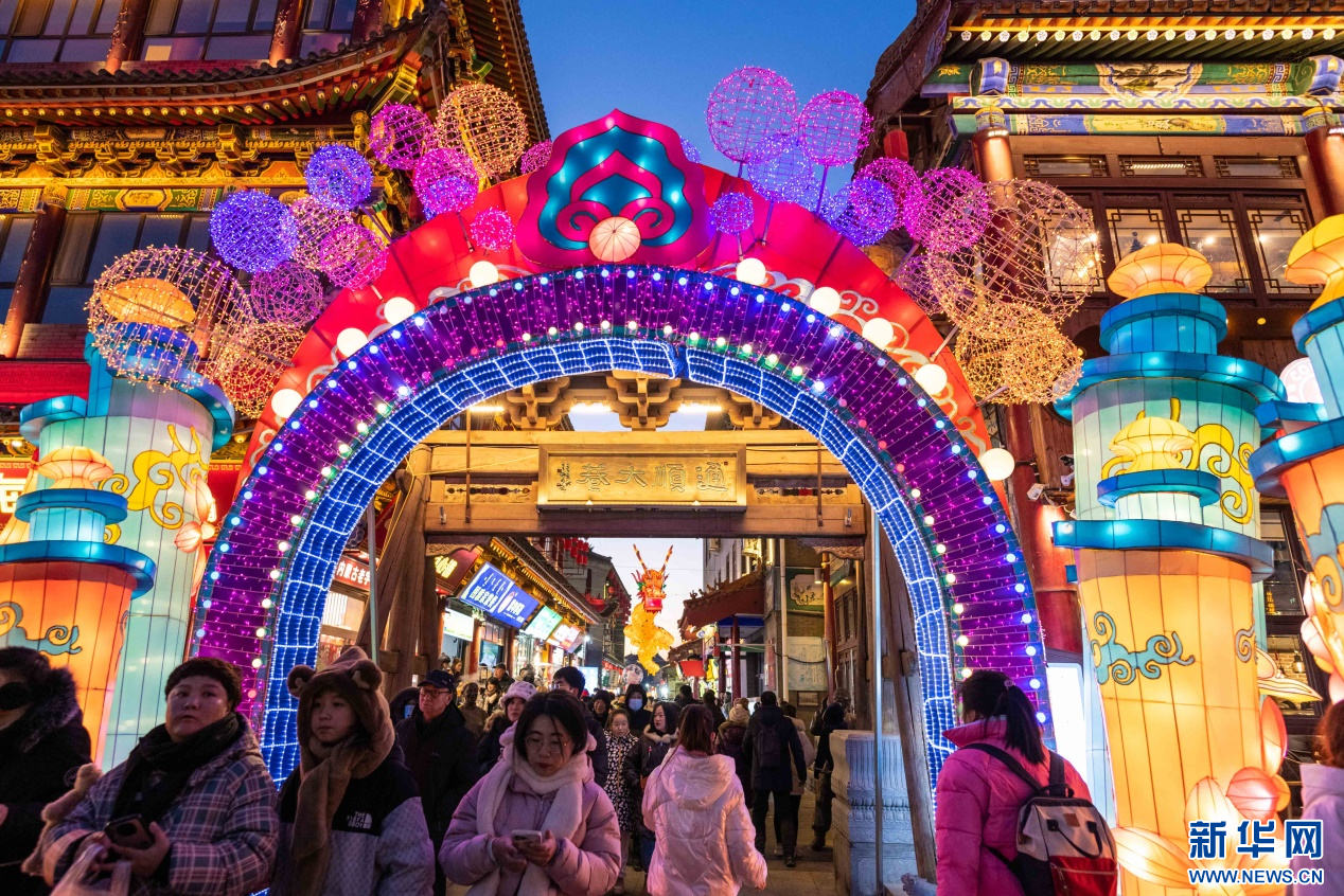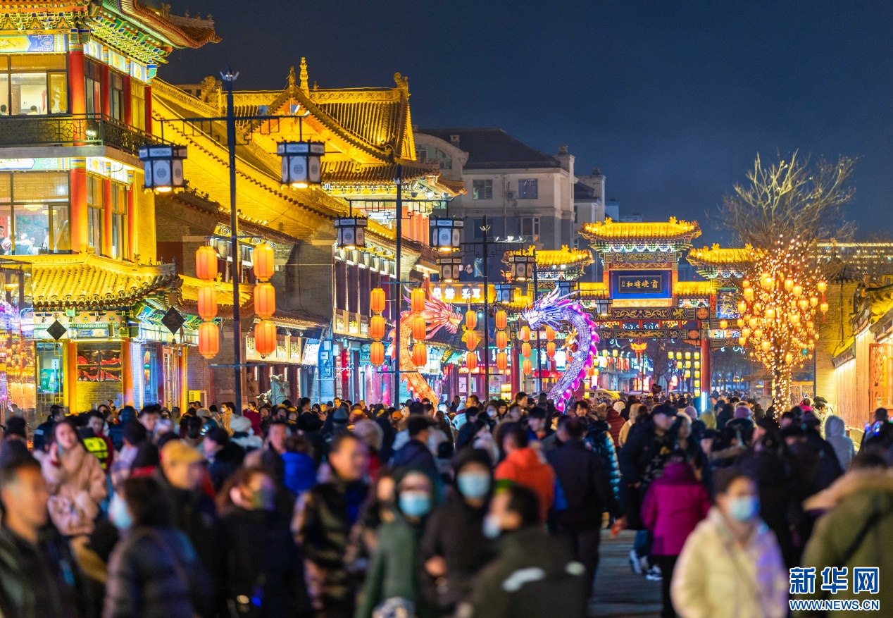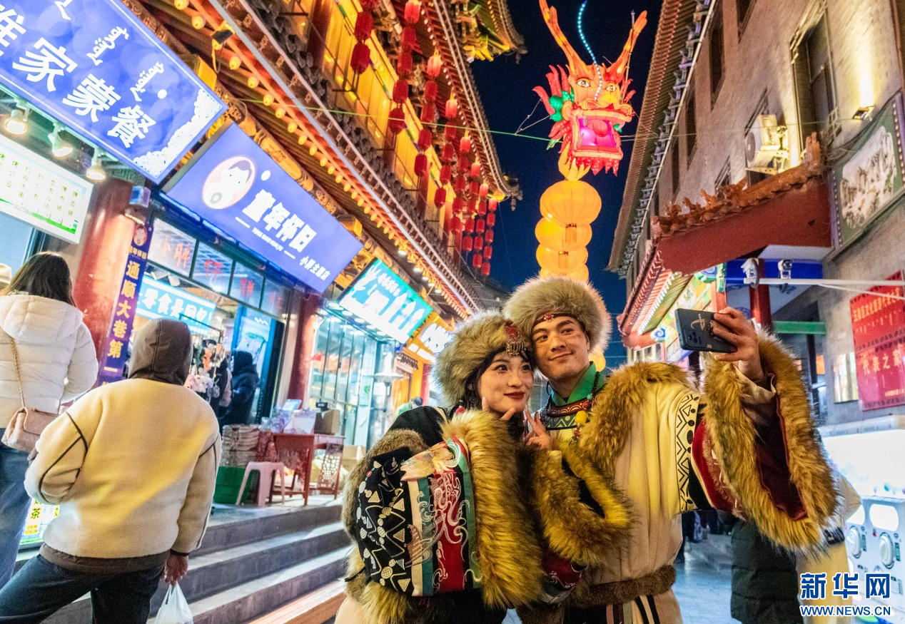 2023年12月31日,游人在呼和浩特市玉泉区塞上老街旅游休闲街区跨年夜活动现场游玩。新华网发(丁根厚 摄)