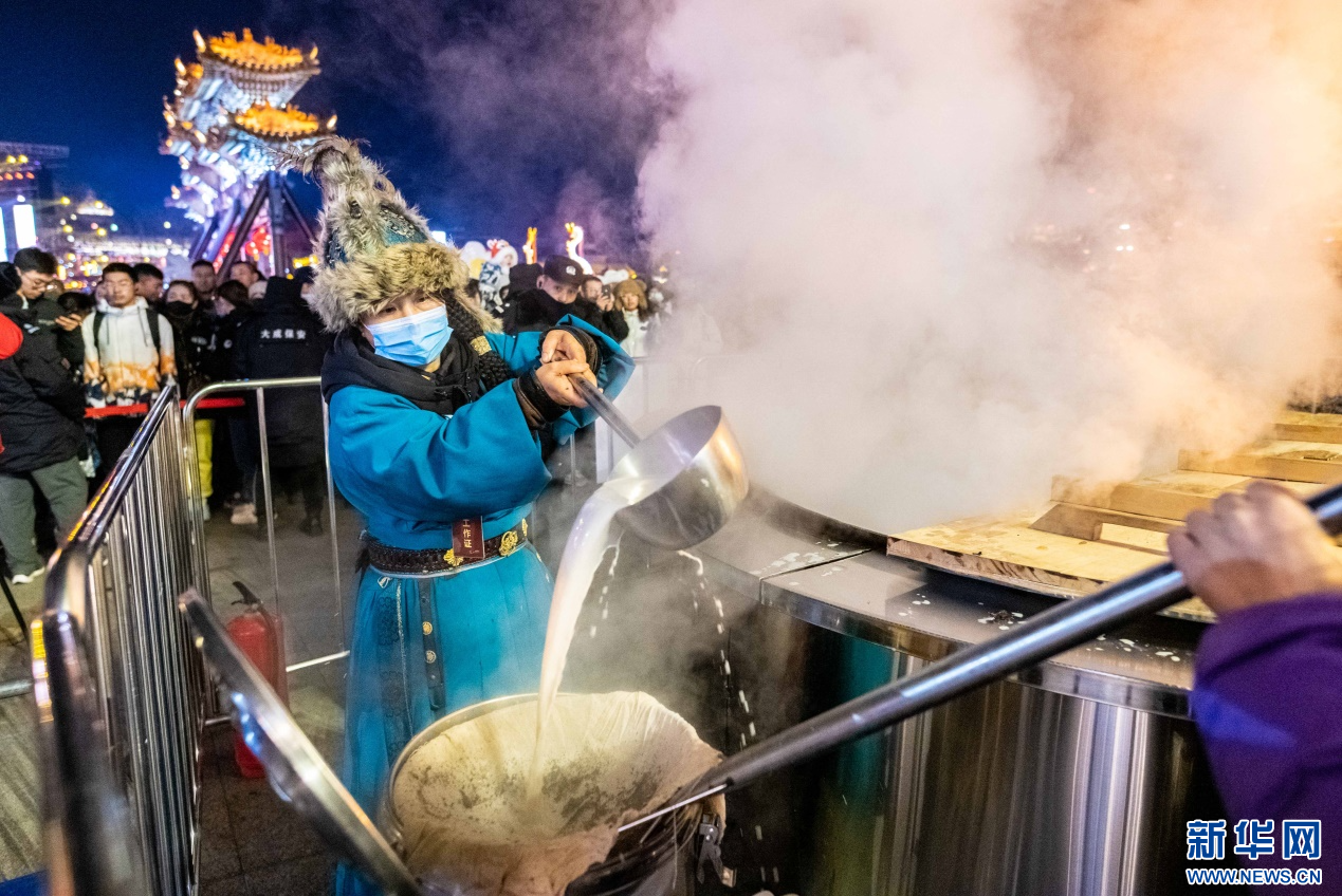 2023年12月31日,工作人员在呼和浩特市玉泉区塞上老街旅游休闲街区“品新年第一杯奶茶”活动现场熬制奶茶。新华网发(丁根厚 摄)