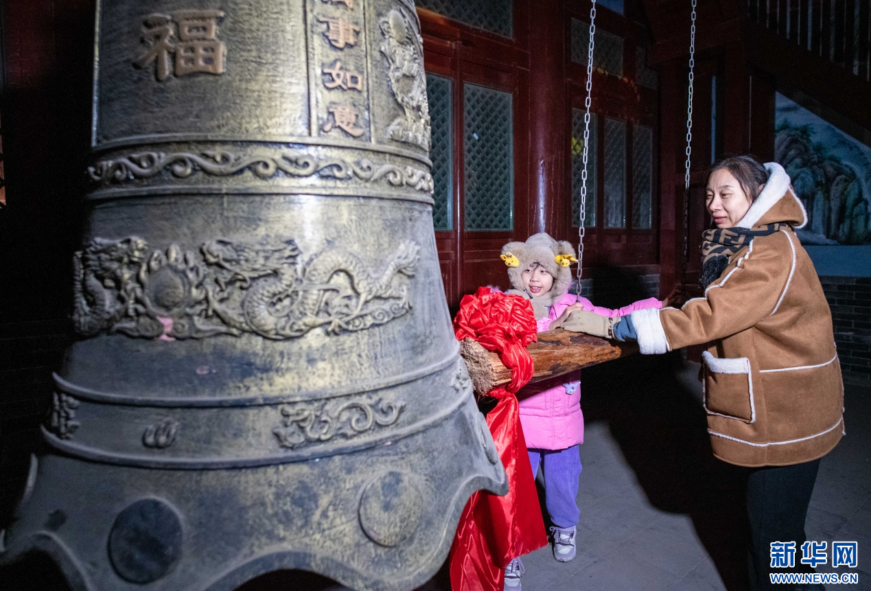 2023年12月31日,游人在呼和浩特市玉泉区塞上老街旅游休闲街区钟鼓楼撞钟迎新年。新华网发(丁根厚 摄)