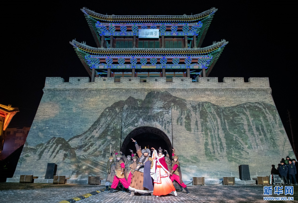 2023年12月31日,演员在呼和浩特市玉泉区塞上老街旅游休闲街区钟鼓楼前表演沉浸式演出“千秋昭君塞上情”。新华网发(丁根厚 摄)