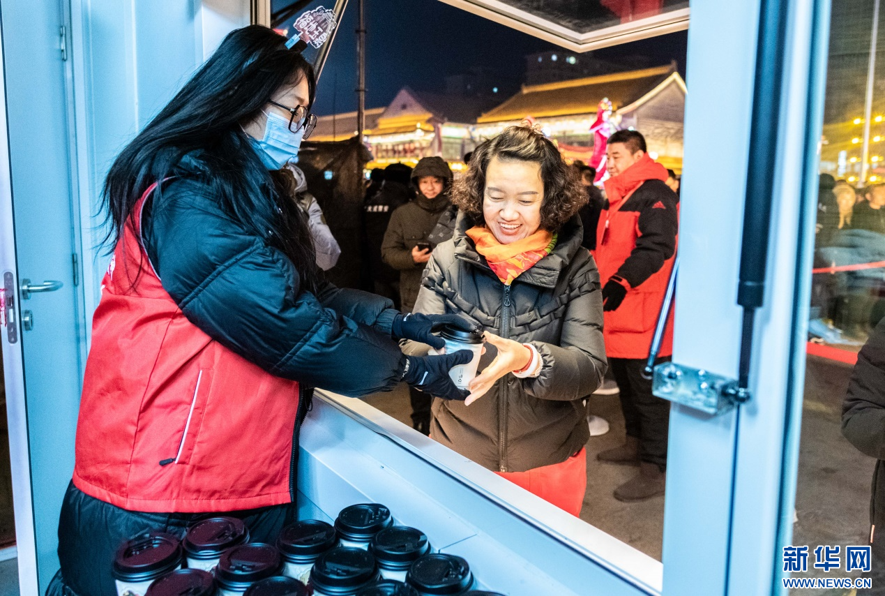 2023年12月31日,游人在呼和浩特市玉泉区塞上老街旅游休闲街区“品新年第一杯奶茶”活动现场免费领取奶茶。新华网发(丁根厚 摄)