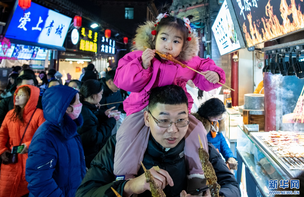 2023年12月31日,小朋友在呼和浩特市玉泉区塞上老街旅游休闲街区跨年夜活动现场品尝特色小吃。新华网发(丁根厚 摄)