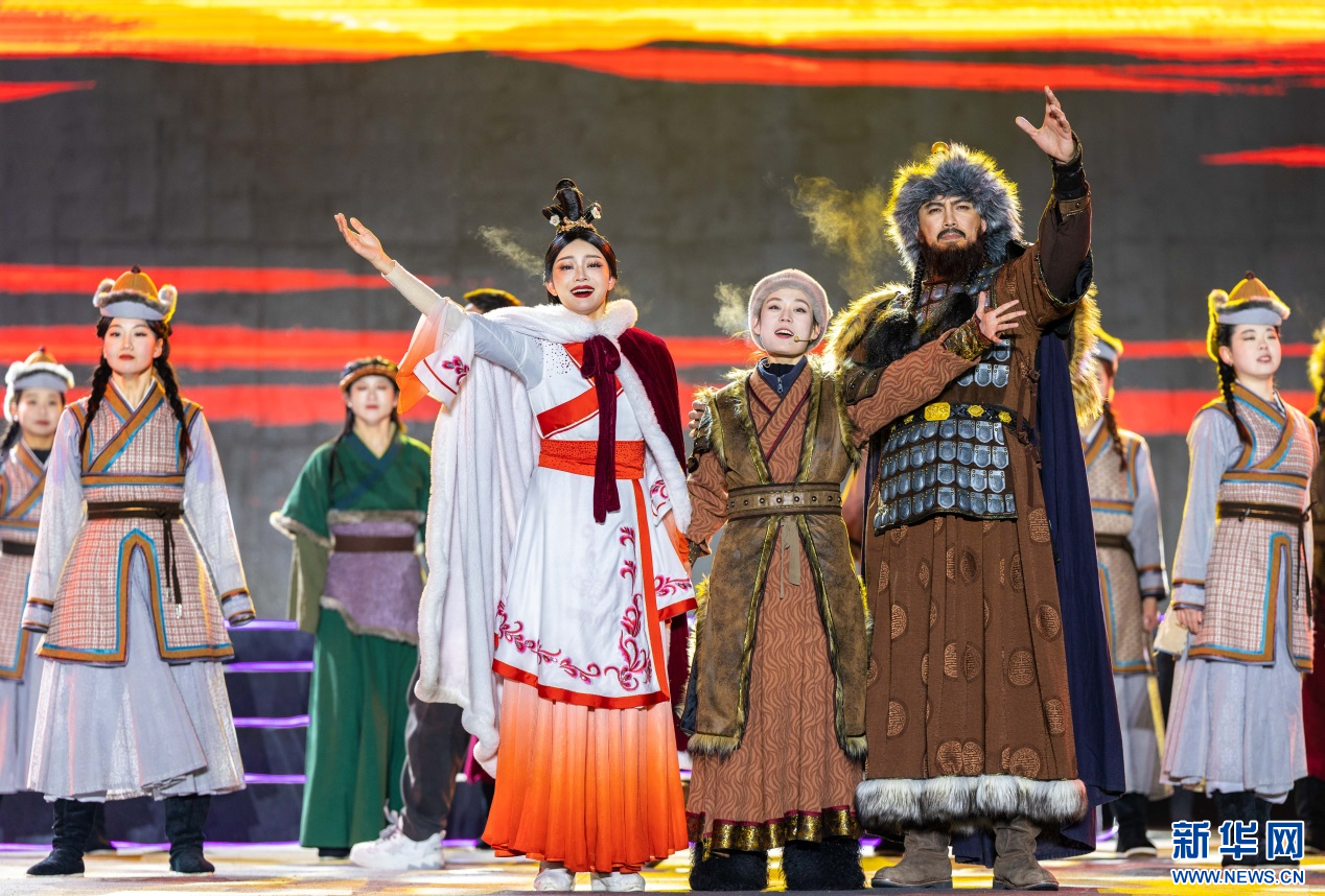 2023年12月31日,演员在呼和浩特市玉泉区塞上老街旅游休闲街区跨年夜活动现场表演沉浸式演出“千秋昭君塞上情”。新华网发(丁根厚 摄)