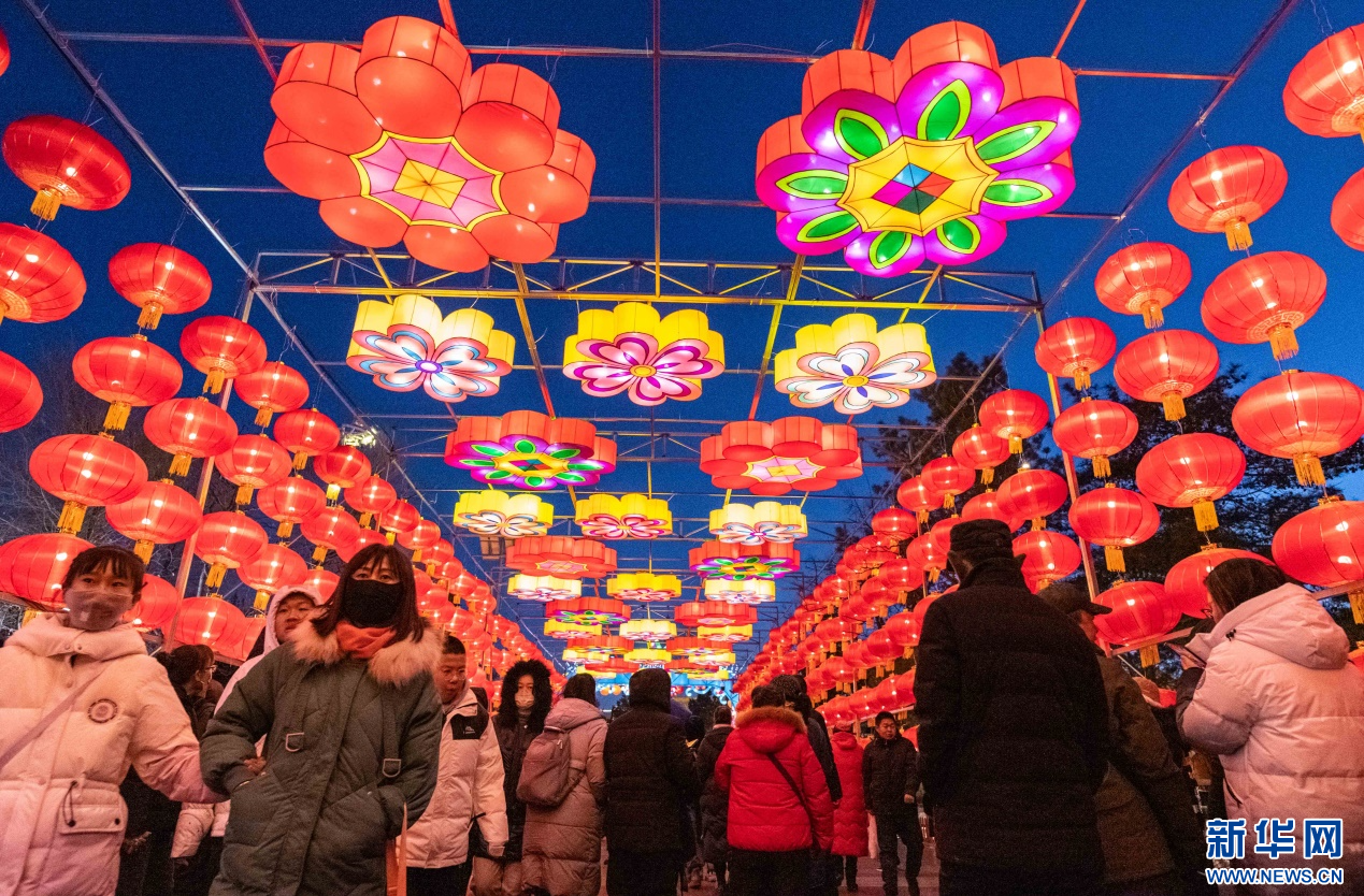 2023年12月31日,游人在呼和浩特市玉泉区塞上老街旅游休闲街区跨年夜活动现场赏花灯。新华网发(丁根厚 摄)