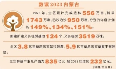 原标题:2023年完成造林556万亩、种草1743万亩、防沙治沙950万亩 内蒙古“绿色版图”不断扩大