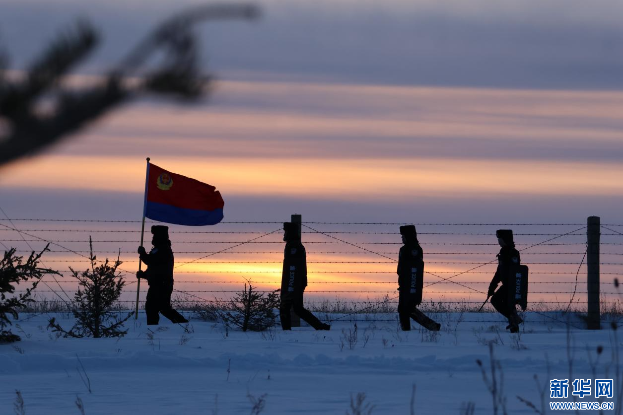 1月9日,踏着日落晚霞,驻守在中俄边境一线的呼伦贝尔边境管理支队黑山头边境派出所民警在边境辖区巡逻。新华网发 (李永健 摄)